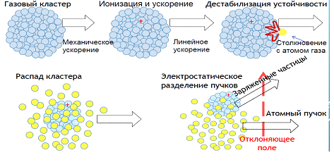 Пучок ускоренных ионизированных кластеров подвергается воздействию потока аргона, подающегося под давлением через дополнительное сопло. При столкновениях атомов аргона с кластерами разрывается часть Ван-дер-Ваальсовских связей, объединяющих частицы в ионизированных кластерах, в результате чего кластеры распадаются на осколки, часть из которых состоит из нейтральных атомов, а часть содержит ионы. Последние отклоняются электромагнитным дефлектором, а оставшийся пучок из нейтральных атомов движутся без изменения траектории к мишени.